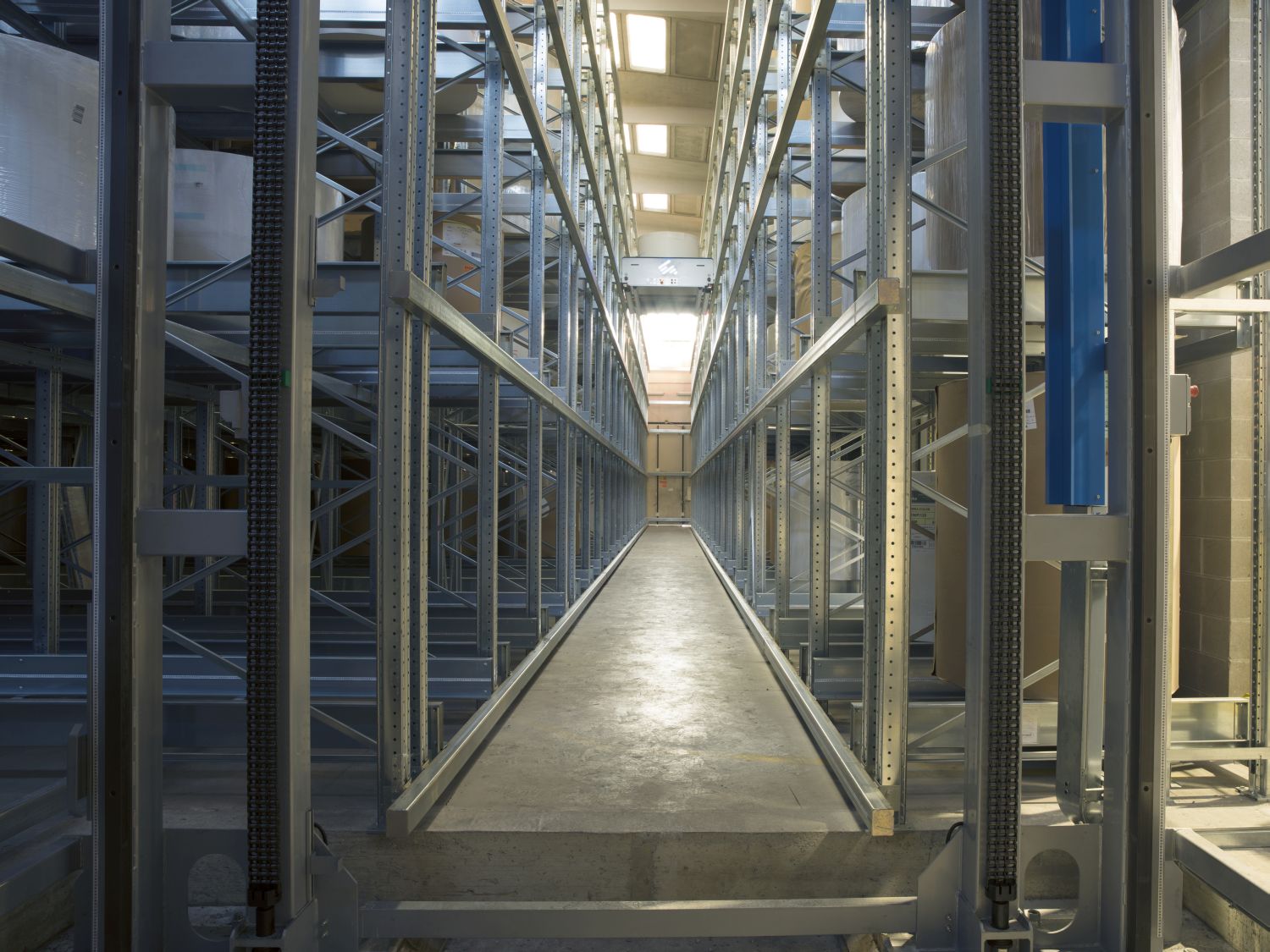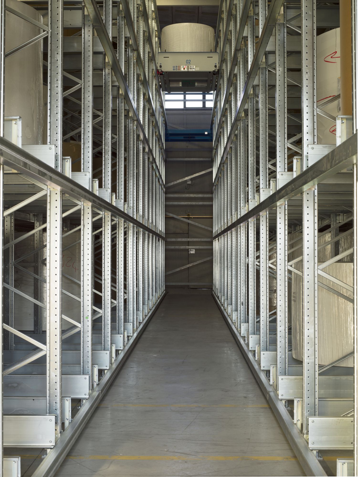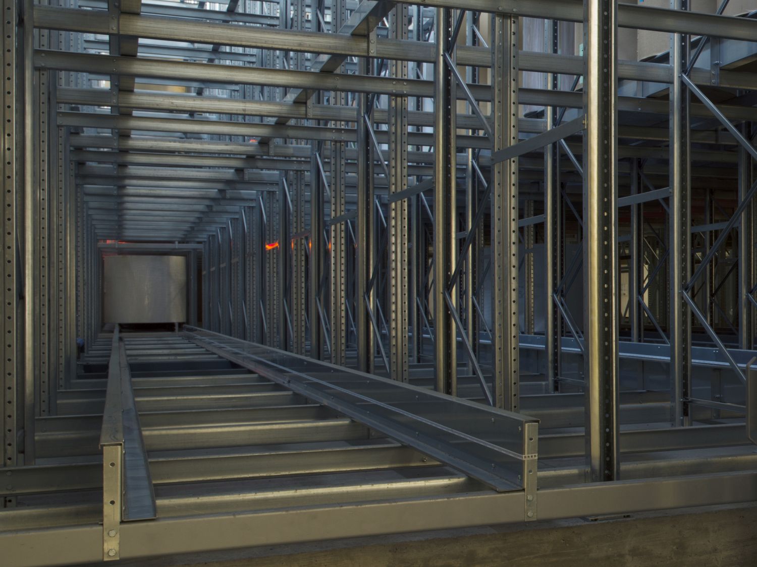 Paleții sunt plasați cu grijă pe șinele de depozitare, iar naveta se întoarce la intrarea în canal pentru a ridica următorul palet.