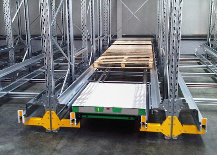Sistemele de rafturi shuttle (cu navetă) oferite de iMetal, care pot fi configurate în LIFO sau FIFO, sunt echipate cu ghidaje speciale care acționează atât ca suport pentru paleți cât și ca pistă satelit.