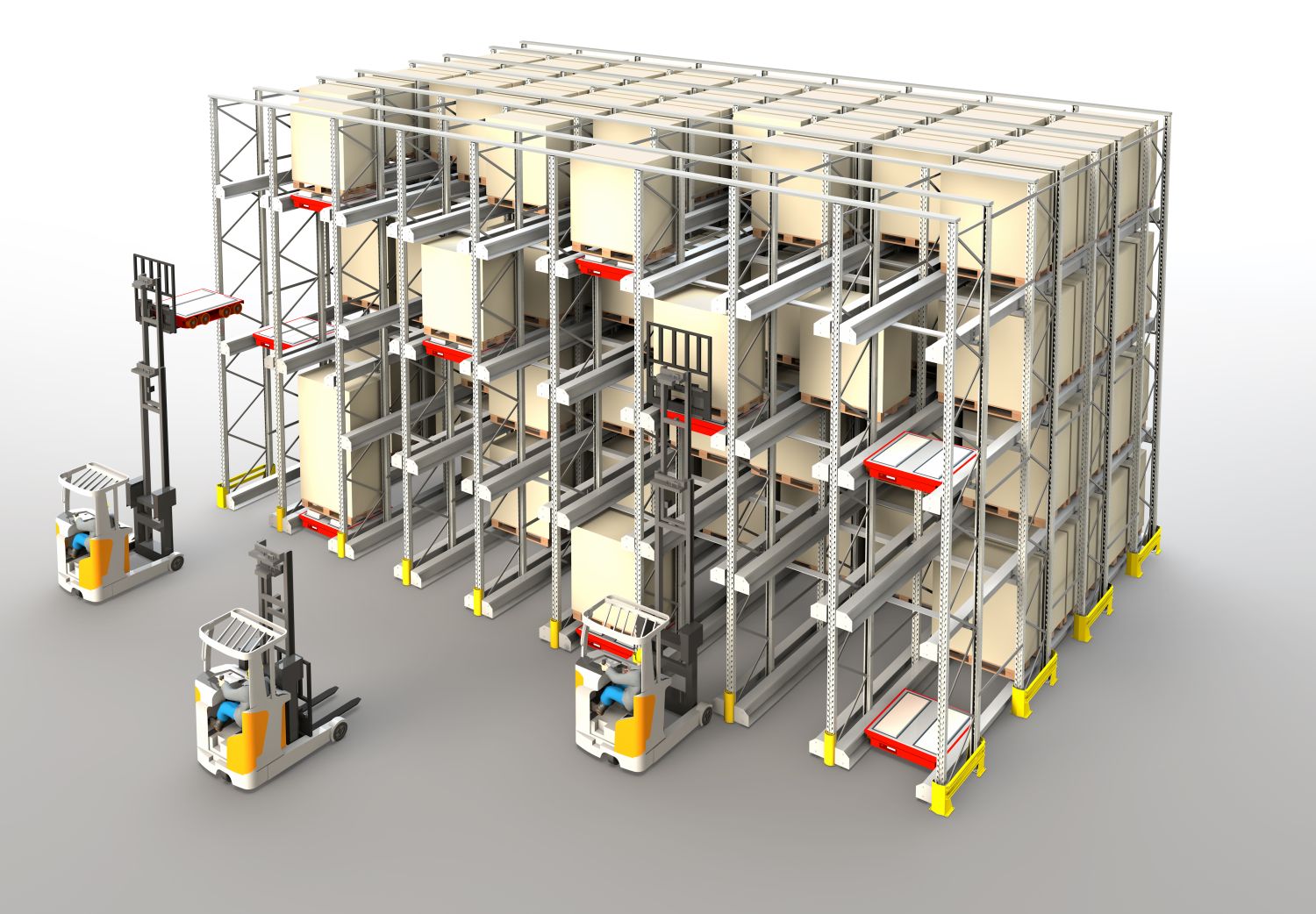 Sistemul, deservit în mod normal de stivuitoare, poate fi implementat și cu sisteme automate de manipulare.